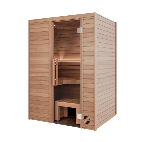 木製パネルと耐熱強化ガラスのドアを組み合わせた構造によって、高いデザイン性と保温性を両立。スイッチを入れてからわずか15〜25分ほどで室温は90度近くに達し、すぐに本格的なサウナに入ることができます。